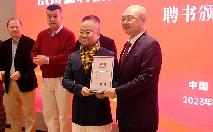 潢川县委书记赵军伟为陈炯颁发“潢川区域品牌艺术总顾问”聘书