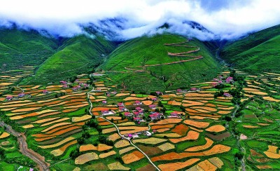 四川省甘孜州炉霍县虾拉沱镇独马村,数千亩青稞梯田渐黄,等待丰收。雷建摄/光明图片