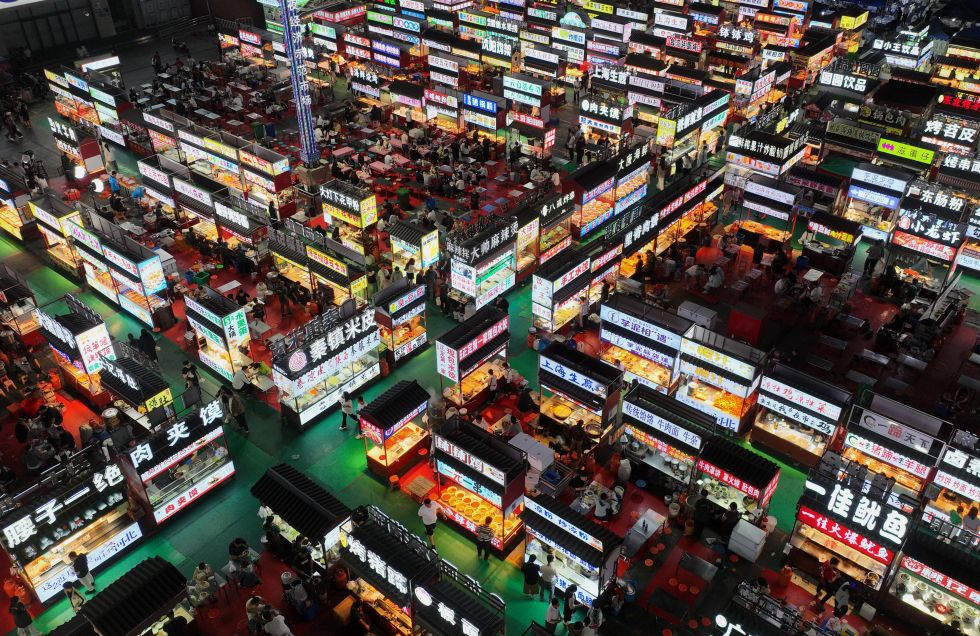 2025年5月15日,游客在河北省正定县小商品夜市品尝美食(无人机照片)。新华社记者杨世尧摄