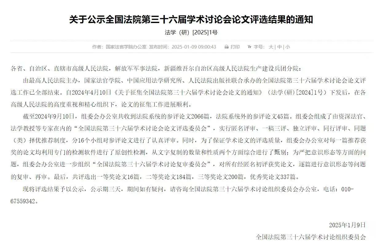 全国法院学术讨论会是全国法院系统参加人数最多、学术权威最高、社会影响最大的学术盛会,代表了全国法院理论研究的最高水平。本届学术讨论会共收到法院系统参评论文2066篇,法院系统外参评论文45篇,最终评选出一等奖16篇、二等奖184篇、三等奖200篇、优秀奖337篇。