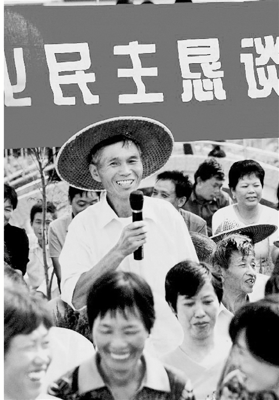 2002年9月18日下午,温岭市新河镇城西村192名村民代表在村晒谷场举行民主恳谈会。图为村民应德友在提合理化建议。