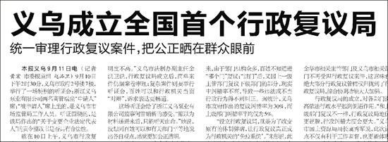 2015年9月12日《浙江日报》报道《义乌成立全国首个行政复议局》。
