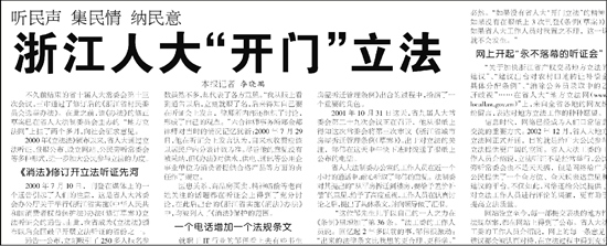 2004年10月14日《浙江日报》报道《浙江人大“开门”立法》。