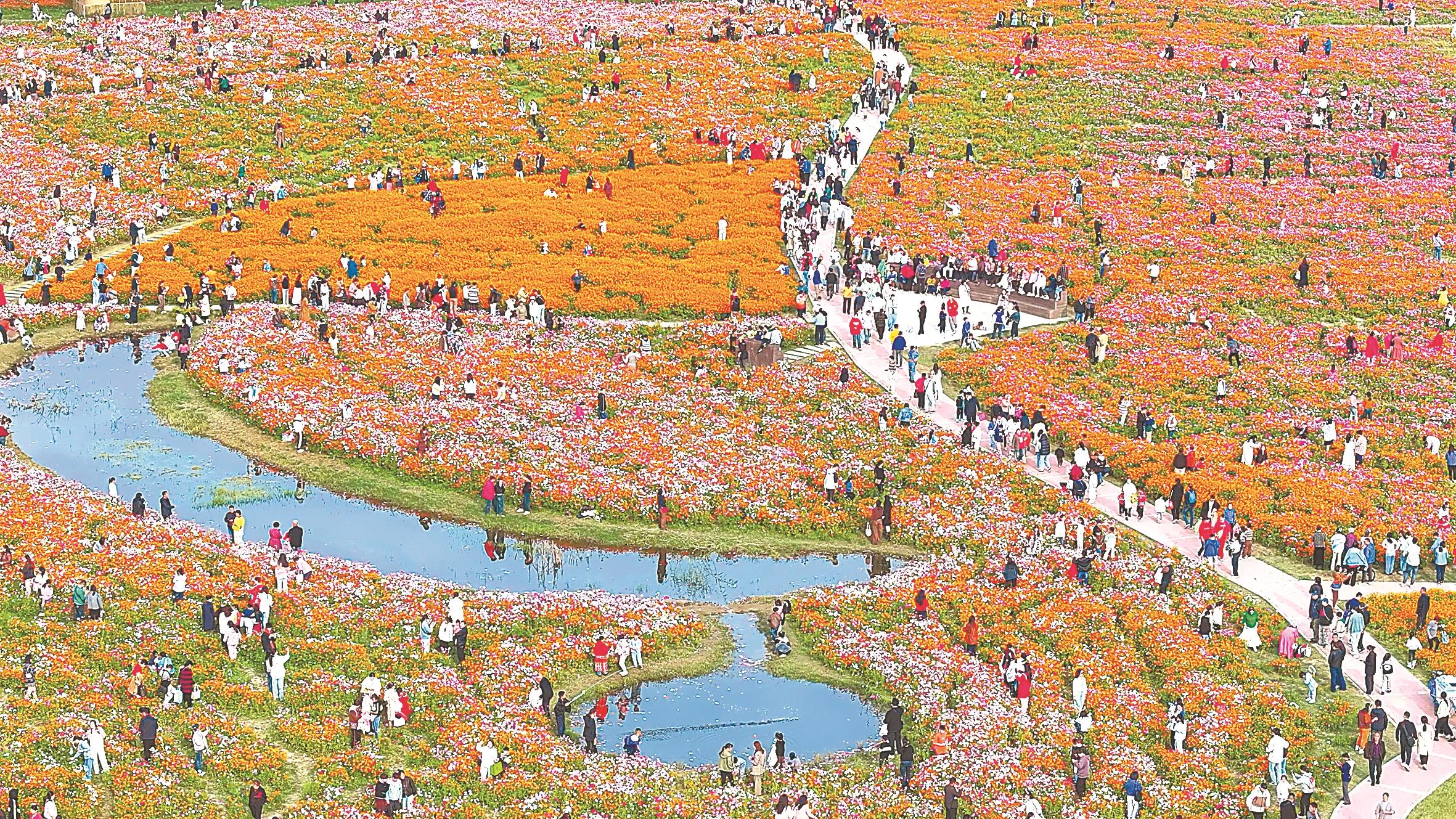 蚌埠“靓淮河”百亩花海盛开,引得当地市民纷纷前来打卡。(资料图片)本报通讯员陈昂摄