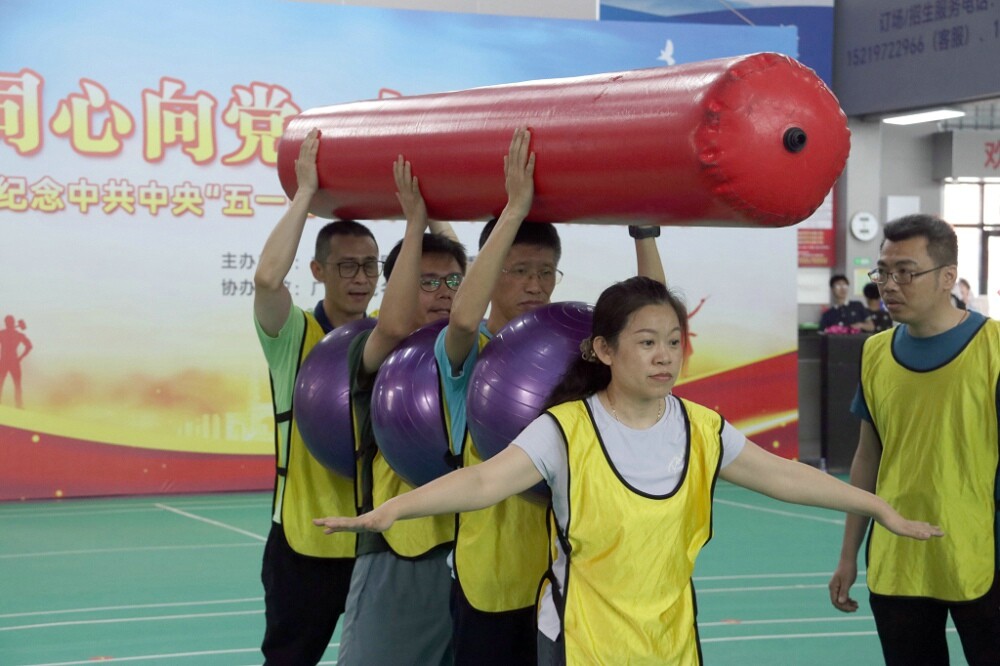 活动以支部为单位组队,分成6支队伍。各队伍齐心协力、互相鼓励,先后完成了马不停蹄、摸石过河、薪火相传共建未来、时代列车等团队竞赛项目,活动现场气氛热烈。