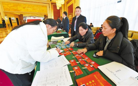 图为1月16日,参加自治区十二届人大三次会议的人大代表向大会报到。记者唐斌洛桑摄