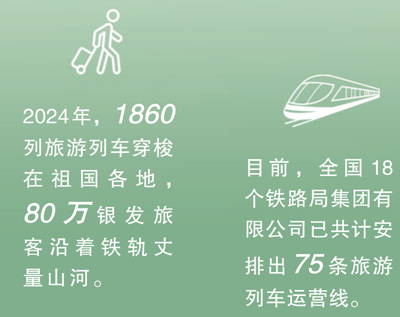 今年2月,商务部、文化和旅游部、中国国家铁路集团有限公司等9单位联合发布《关于增开银发旅游列车促进服务消费发展的行动计划》,指出要扩容旅游列车线路和产品,丰富银发旅游列车产品供给,建立品质型、舒适型、普惠型产品体系。目前,全国18个铁路局集团有限公司已共计安排出75条旅游列车运营线。一趟趟银发列车如春日繁花次第绽放,为老年人铺就通往诗与远方的旅途,更以流动的风景线激活沿线文旅消费,为推动经济高质量发展注入“银发”新动能。
