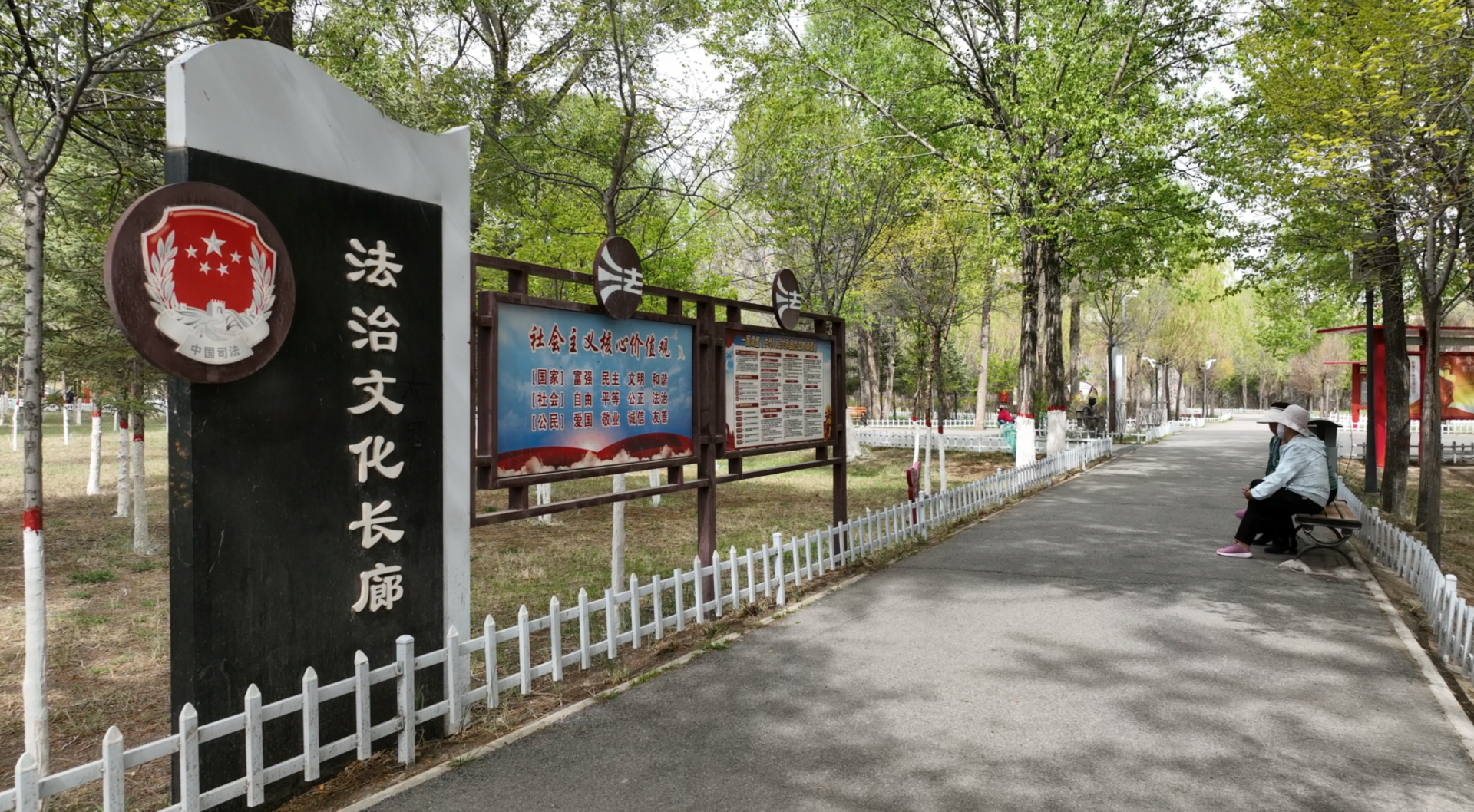 沿着步道前行,法治典故石刻讲述着“徙木立信”“包公断案”等历史故事,法治漫画墙用生动画面解读《中华人民共和国民法典》热点,如高空抛物、宠物扰民等。