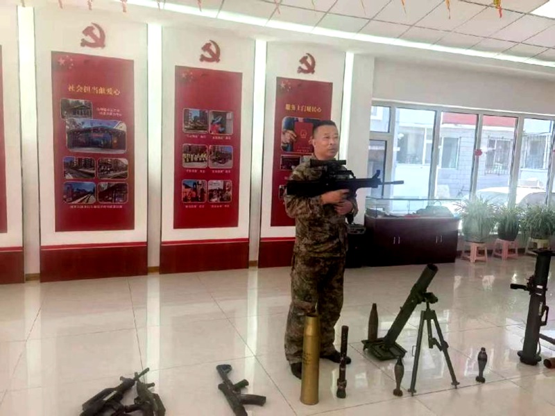 活动现场,仿真军事装备整齐陈列,吉林省佳德国防教育基地董事长赵振平详细介绍装备性能、作战用途及国防意义。