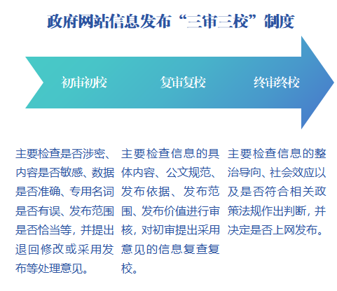 (三)政府信息管理。遵循《中华人民共和国政府信息公开条例》有关规定基础上,严格落实信息发布“三审三校”审核制度,构建起办公室专人统筹、各业务科室分工负责保障政务信息内容、分管领导终审把关的工作机制,严格实行先审后发、应审尽审,扎实做好信息发布审核和保密审查,确保公开内容规范准确、合规合法。